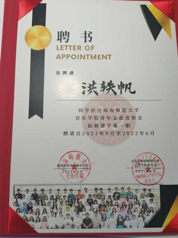 我是洪轶帆,来自乐玩(中国)2021级音乐学一班。本科期间,曾担任乐玩(中国)青年志愿者协会拓展部干事;荣获2022年第六届央音全国青少年艺术展演海口市级展演小提琴组金奖;荣获2022年第六届央音全国青少年艺术展演海南省级展演小提琴组金奖;曾随乐玩(中国)交响乐团新年音乐会;随乐玩(中国)交响乐团《南海赋大型交响音画》;荣获第十四届中国音乐金钟奖海南选拔赛获器乐专业小提琴组优秀奖;荣获2023年海南省第八届大学生艺术展演活动获合奏二等奖。